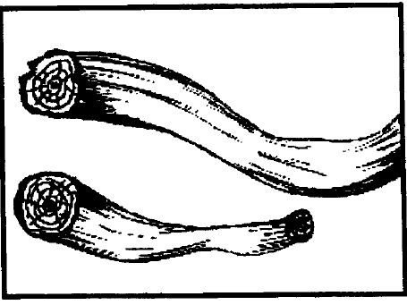 ويحدث هذا الالتواء من الجذع كله أي من أول الجذع حتى نهايته، فهو لا يصلح للأعمال الكبيرة لذلك يتم تقطيعه إلى اجزاء صغيرة تفيـد بعـض أنـواع المشغولات الصغيرة، وهو ناتج عن حركات الرياح السريعة والفجائية. كما في الشكل التالي: