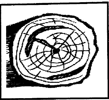 في هذه الحالة يكون لب الأخشاب قد نما بعيداً عن محور الشجرة على شكل بيضوي وذلك نتيجـة خلـل في توزيع المادة الغذائية للمحيط بالإضافة لوجـود ضغط معين من احدى جهات الشجرة، كما في الشكل التالي:
