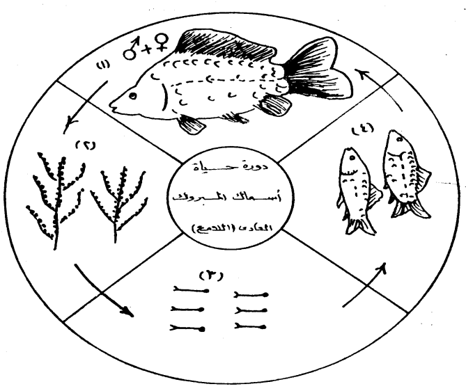 شكل يبين دورة حياة اسماك المبروك الصيني حيث: