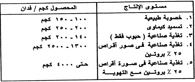 والجدول يبين معدلات إنتاج المبروك العادي تحت مستويات إنتاجية مختلفة.
