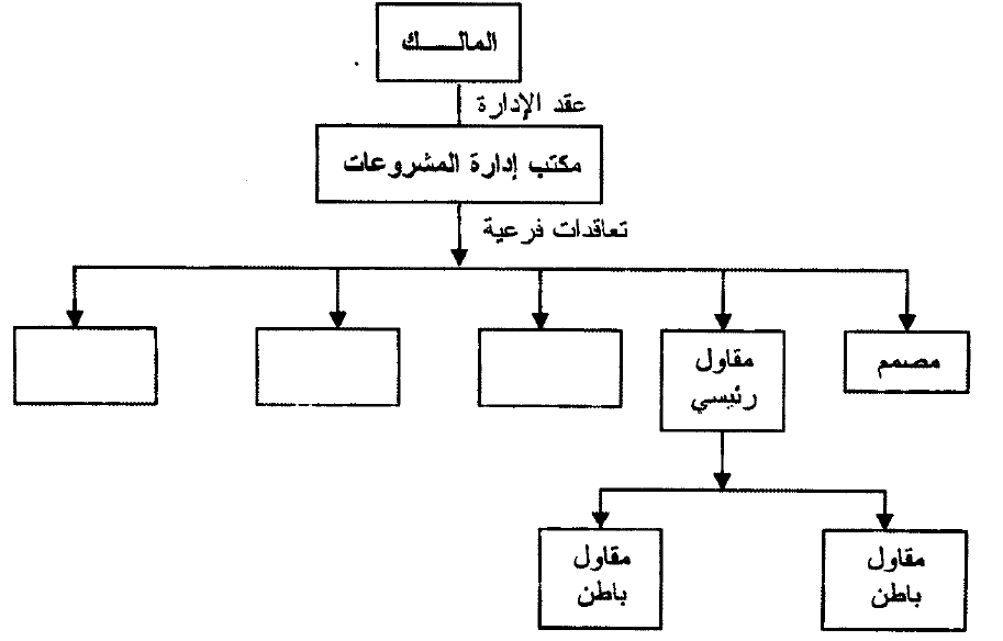 يتم هذا النوع من التعاقدات بين المالك كطرف أول وبين مكتب متخصص في إدارة المشروع كطرف ثاني ، على أساس أن يقوم هذا المكتب بإدارة المشروع في جميع مراحله (دراسة الجدوى التصميم - التعاقد - التنفيذ - التسليم ) أو في بعض هذه المراحل فقط ، وذلك يتوقف على إمكانيات المالك وطبيعة المشروع ، فقد يقوم الطرف الثاني مثلا بإدارة مرحلة التصميم والتنفيذ أو أحدهما ، وقد يشارك في مرحلة دراسة الجدوى والإشراف على مرحلة العطاءات مثلا . ويتميز هذا النوع من التعاقدات بقيام الطرف الثاني (إدارة المشروع) ونيابة عن المالك بالتعاقد مع المقاول الرئيسي ومقاولي الباطن والموردين والتعامل معهم نيابة عن المالك ، ومن خلال خبرته العالية في إدارة مشروعات التشييد يمكن تحقيق نتائج ممتازة من ناحية الجودة وزمن التنفيذ وتكلفة المشروع التي تقل كثيرا نتيجة المستوي العالي من الإدارة والشكل التفصيلي التالي يوضح طبيعة هذا النوع من التعاقدات: