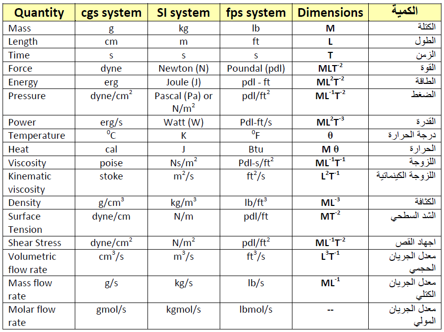 الجدول اعلاه يوضح وحدات الكميات الشائعة .