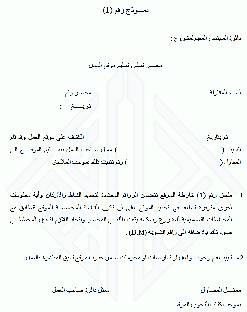 أ- أن تتولى دائرة المهندس المقيم ( بمشاركة المساحين ) دعوة المقاول لاستلام الموقع بموجب العقد ويتم ذلك بموجب محضر ينظم لهذا الغرض وفق النموذج المرقم (1) والذي يغطي المادة الثالثة والأربعين من الشروط العامة ويتم إرسال نسخ من المحضر الى الجهات المعنية .