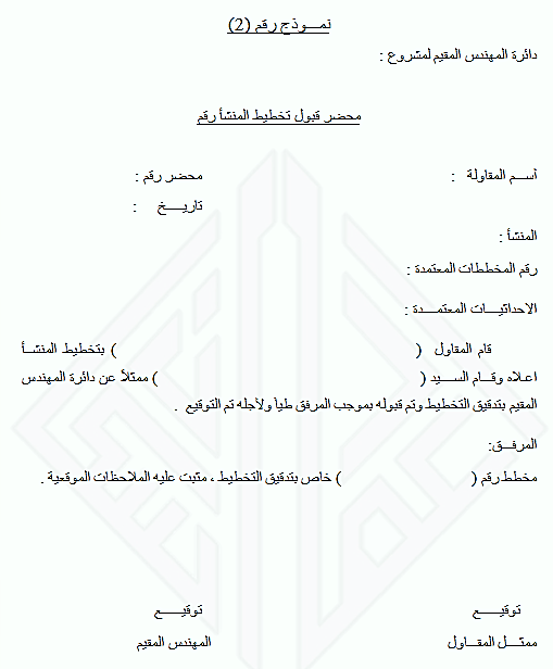 لا يجوز المباشرة بأية أعمال تنفيذية قبل تدقيق التخطيط ( جزءاً أو كلاً ) من قبل المهندس المقيم ويتم ذلك بموجب محضر وفق النموذج رقم (2) وبموجب المادة السابعة عشر من شروط المقاولة لأعمال الهندسة المدنية .