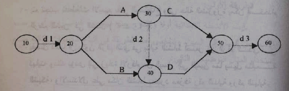 ولكن ذلك الرسم يضيف شرط غير حقيقي وهو أن النشاط C يعتمد على النشاط B بينما هذا الشرط غير موجود ولحل هذه المشكلة يستخدم فكرة النشاط الوهمي d1 والذي يطلق عليه Logic Dummy ، ويتم رسم هذا النشاط في شكل خط غير متصل ويصبح الرسم كما هو مبين في شكل (8).
