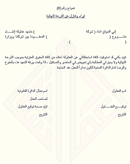 نموذج رقم ( 9 ) – ابراء وتنازل عن الذرعة النهائية