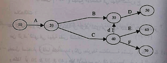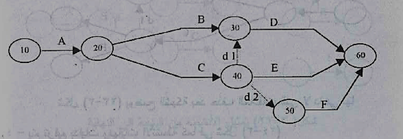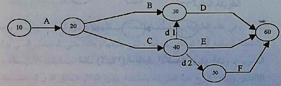 5- بتجميع الأنشطة المنتهية للمشروع في نقطة واحدة نلاحظ ظهور نشاط و همـي آخر d2 لازم حتى لا تأخذ الأنشطة E,F نفس الترقيم، ويصبح التخطيط في صورته النهائية كما في شكل 5 :
