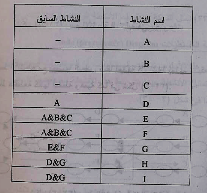 الجدول التالي يمثل مجموعة من بنود أحد مشروعات التشييد وعلاقة كل منها بالأنشطة الأخرى. والمطلوب تخطيط هذا المشروع بطريقة المسار الحرج مستخدما أسلوب الأسهم في الرسم. :