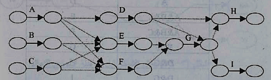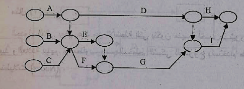 1- يتم رسم الأنشطة الثلاثة الأولى A,B,C والتي لا تعتمد على أنشطة قبلها في أقصي اليسار والأنشطة الأخيرة H,I في أقصى اليمين وباقي الأنشطة بينهما طبقا للاعتماديات المذكورة في الجدول كما في شكل 11 :