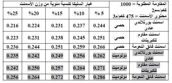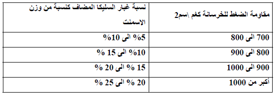 ب- يمكن فرض محتوى غبار السليكا طبقا لمقاومة الضغط المطلوبة كما هو موضح بالجدول الآتي: