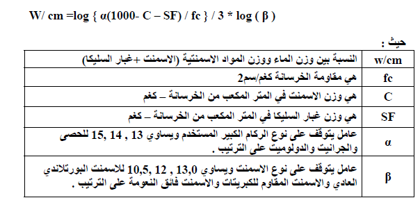 -4- بتطبيق معادلة W/cm مع مراعاة ان قيمة الفا = 15 وقيمة بيتا =12 نحصل على نسبة الماء الى المواد الاسمنتية = 0.294