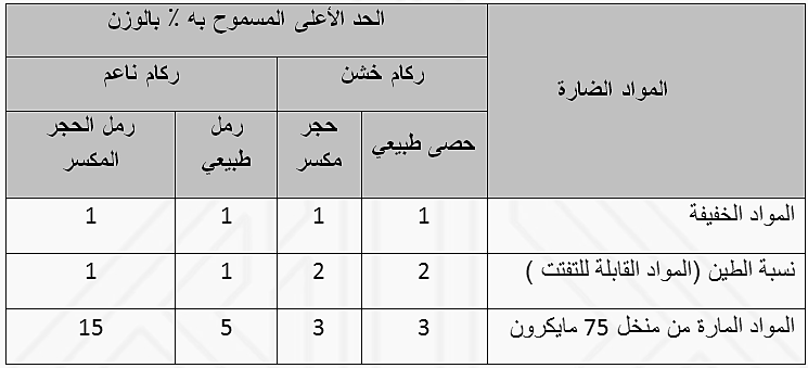 جدول ( 2 ) : النسب المسموح بها من المواد الضارة في الركام الناعم والخشن