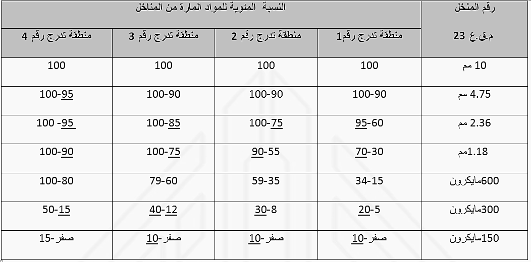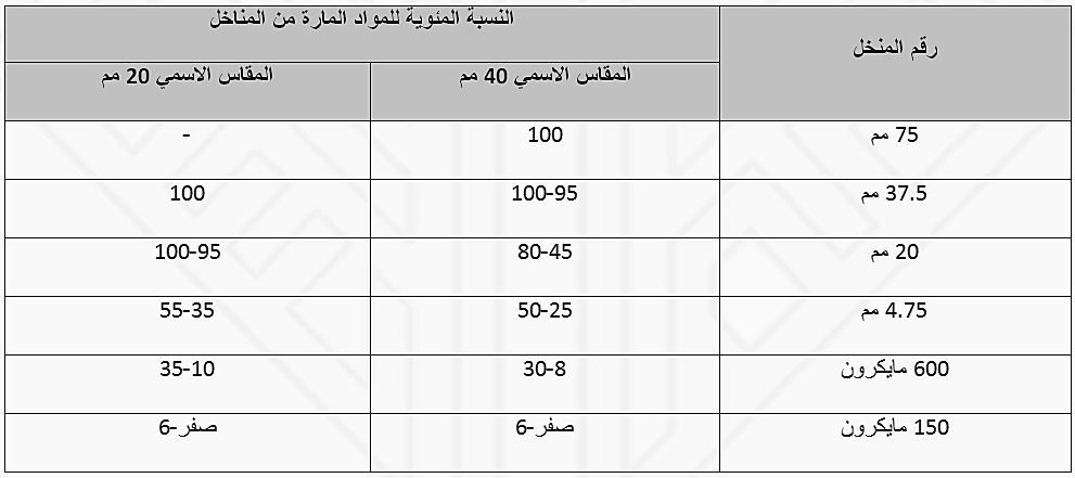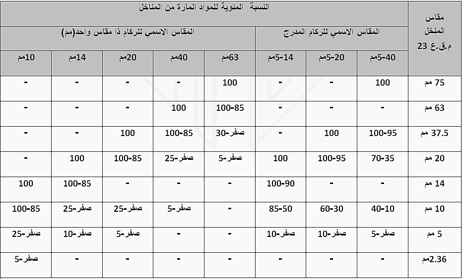 3- الركام الشامل: يكون الركام الشامل ذا مقاسات مدرجة حسب جدول رقم ( 5 )