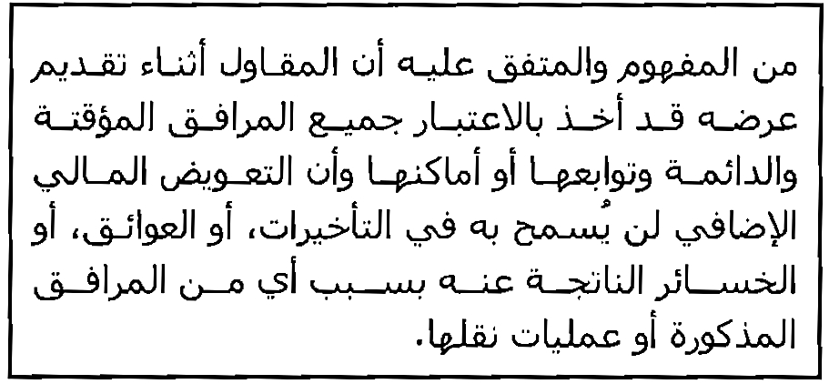 يجب على جميع أطراف المشروع أن تفهـم بنـود الـعـقـد بـوضـوح وخاصة تلك المتعلقة بالتأخيرات والزمن الإضافي. قبل توقيع العقـد مـن قبـل المقاول ، عليه أن يستشير شخصاً مؤهلاً ممـن هـم علـى اطلاع واسع بالقضايا الإنشائية وقوانين السلطات القضائية حيث يتم تنفيذ بنود العقد أو الحكـم بمقتضاها.