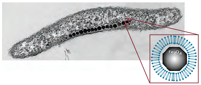 شكل 11-2: البكتيريا الممغنطة التي تحتوي على سلسلة من الأجسام المغناطيسية. الشكل في المربع يوضّح تفاصيل الجسم المغناطيسي. عن: (2008 ,Scler).