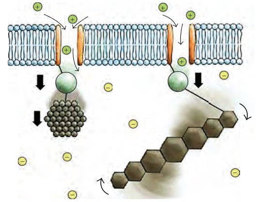 شكل 11-4: نموذجان افتراضيان لتحويل الطاقة الكهربائية إلى قوة فيزيائية عن طريق فتح قناة الأيونات الموجبة في غشاء الخلية ممكنا من الإشارات العصبية. تجمعات من بلورات المركبات المغناطيسية (يسار) مرتبطة ببوابة قناة متحسّسة للقوة بواسطة خويط من الهيكل الخلوي تتحرك على طول قوة المجال المغناطيسي الأرضي وسلسلة من بلورات المركبات المغناطيسية لها عزم ثابت تدور حسب المجال المغناطيسي الخارجي (يمين) ويقوم الخويط بنقل العزم إلى القناة الأيونية عن: (2019) Vacha.