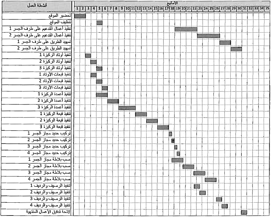 لقد بقيت نهاية المشروع على حالها ، لكن أنشطة تنفيذ التدعيم قـد انتقلت أو تأخرت بسبب تأخر نشاط تنظيف الموقع . كما هو متوقع ، لا يوجد تأخير على المسار الحرج. وكما تظهر الجدولة الزمنية التخطيطية المعدلة في الشكل (2) الظروف الفعلية للأسابيع الخمسة الأولى من المشروع والأسابيع التخطيطية المعدلة للأعمال المتبقية.