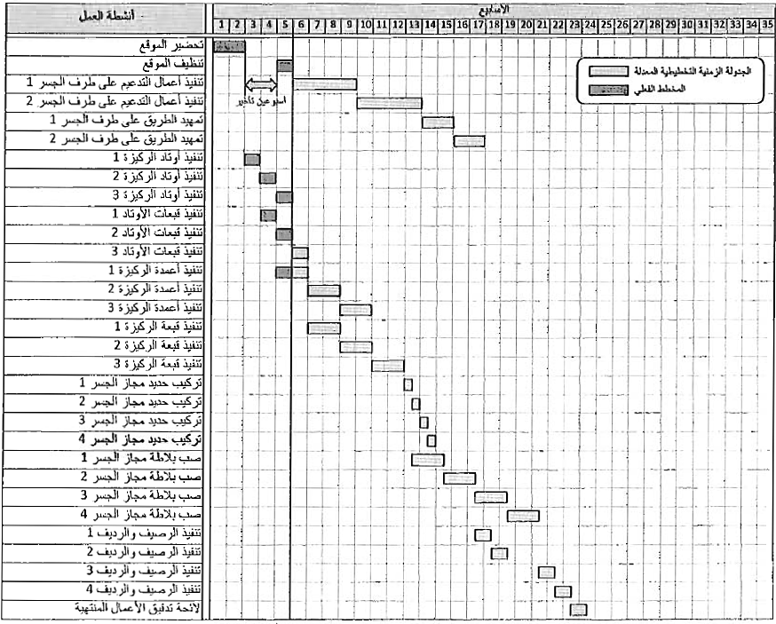 بالاعتماد على المعلومات الفعلية، يقرر المحلل تحديث الجدولة الزمنية عند نهاية الأسبوع 11. يظهر المخطط الفعلي في الشكل (3) أن تنفيذ أعمال التدعيم لم تبدأ بعـد وأيضاً تنفيذ أعمال قبعات الركائز. أما تنفيذ أعمدة الركيزة الأولى والثانية ، فقد انتهت في وقتها المحدد، بينما استغرق تنفيذ أعمدة الركيزة الثالثـة أسبوعاً إضافياً. بالاعتماد على الجدولة الزمنية المحدثة والمعدلة في الشكل (3)، يستنتج المحلل أن المشروع قد تأخر الآن خمسة أسابيع. وذلك بسبب البداية المتأخرة لتنفيذ أعمال قبعة الركيزة الأولى، التي تأثرت بتأخر نهاية تنفيذ أعمدة الركيزة الثالثة والتي كانت تقع على المسار الحرج الأصلي. ولأن نشاط تنفيذ قبعة الركيزة الأولى يبدأ في الوقت المحدد ، انتقل المسار الحرج لاعتماده فقط على تنفيذ أعمال قبعات الركائز.