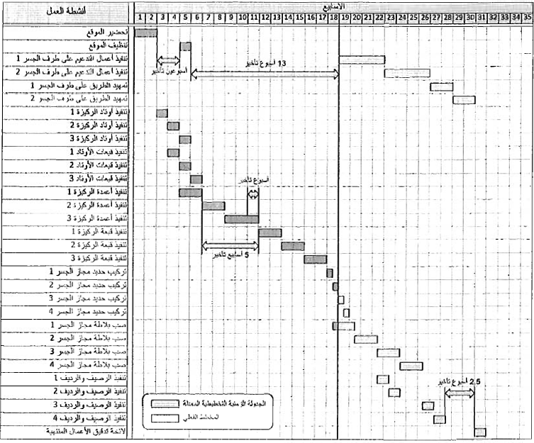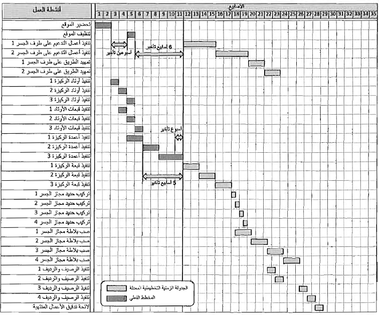 تشبه عملية تحديد مـدد التأخيرات باستخدام المخططات الشريطية الطريقة التي سنشرحها لاحقاً باستخدام طريقة المسار الحرج. وللبدء بهذه العملية ، يحضر المحلل مخطط فعلي تفصيلي يظهر بشكل محدد زمن تنفيذ العمل فعلياً. عندما يحضر المحلل المخطط الفعلي ، تبدأ عندها عملية التحليل. يظهـر الشكل (1) المخطط الفعلي لمشروع إنشاء الجسر، حيث بدأ نشاط تحضير الموقع في موعده المحدد (اليوم 1 من الأسبوع 1)، وانتهى كما هو مخطط له (في نهاية الأسبوع 2). بينما لم تسلك الأنشطة المتبقية نفس الطريقة التخطيطية. في هذا المثال ، بدلاً من تحليـل كـامـل المشروع ، سنقوم بتحليل أول ثلاث تأخيرات لإظهار منهجية تحليل التأخيرات التي يمكن تطبيقها على باقي المشروع .