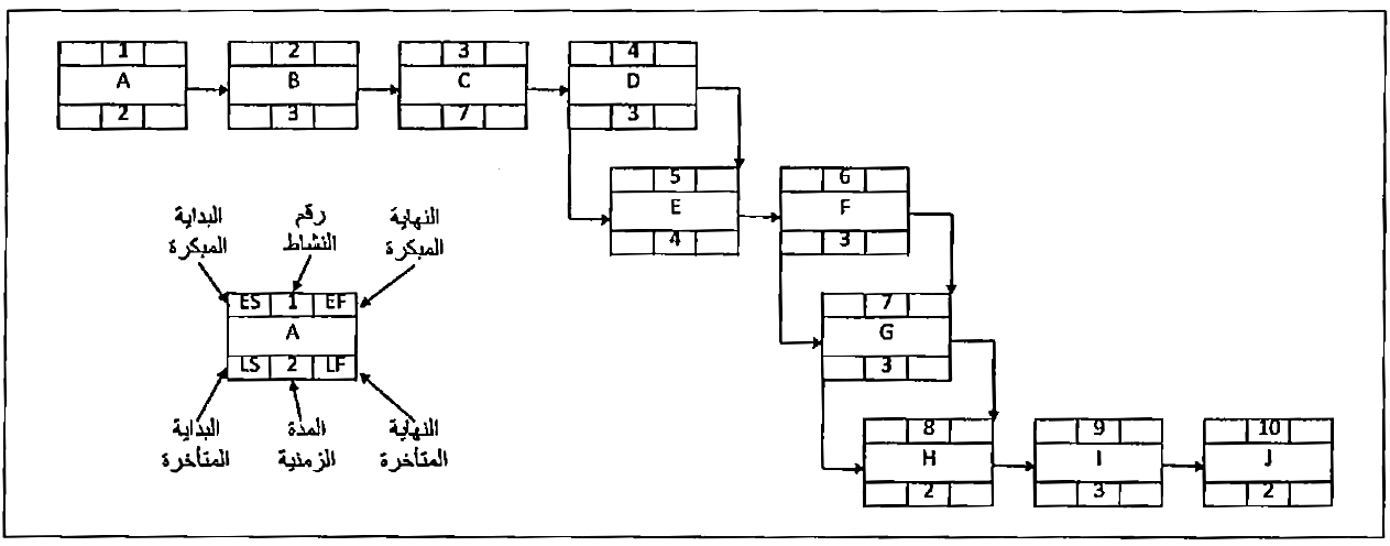 لشرح ومقارنة تقنيات التقييم السابقة ، نأخذ مشروع بناء مرآب. حيث الجدولة الزمنية التخطيطية لهذا المشروع تحتوي على 10 أنشطة فقط وتظهر على شكل شبكة أنشطة في الشكل (1).