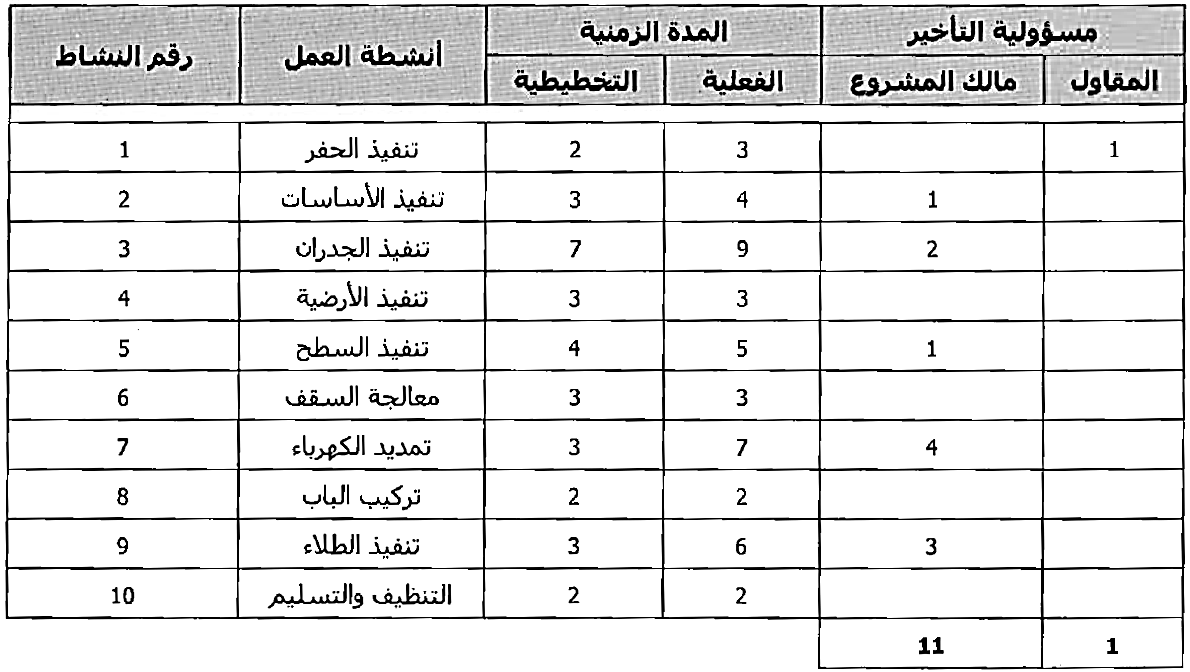 المدة التخطيطية لبناء المرآب كانت 32 يوم، لكن المدة الفعلية أصبحت 40 يوم. متمثلة بتجاوز 8 أيام. تظهر المراجعة المبدئية أن التأخير الحاصل على أنشطة العمل مفصل في الجدول التالي :
