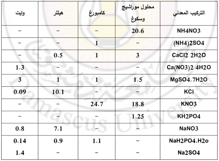 ويمثل الجدول (1) مكونات بعض المحاليل المعدنية من العناصر المعدنية الكبرى المستخدمة بزراعة النسج.