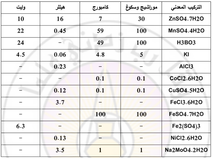 الجدول (2): تركيب بعض المحاليل المعدنية من العناصر الصغرى (ميكرومول).