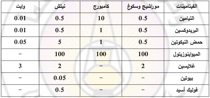 الجدول (3) تركيب بعض المحاليل المغذية من الفيتامينات (مغ/ل)