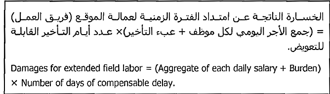 وهكذا تكون خسارة المقاول فعلياً هي 290,000 ل.س. مـن أجـل كلفة العمالة المباشرة الناتجة عن التأخير. يمكن أن يضيف المقاول عبء التأخير المناسب لهذه القيمة لحساب كلفة العمالة الإضافية الكلية المنسوبة للتأخير.