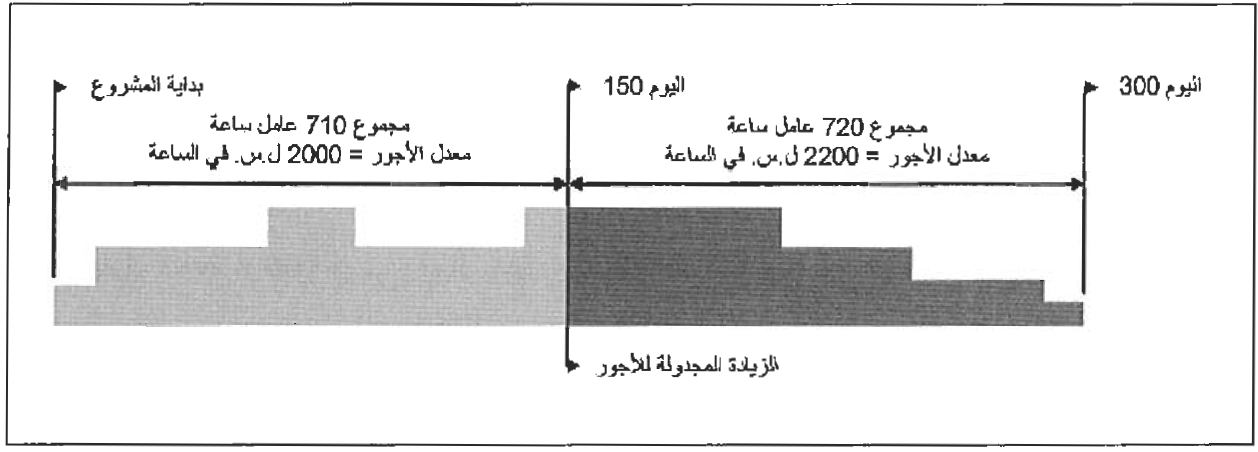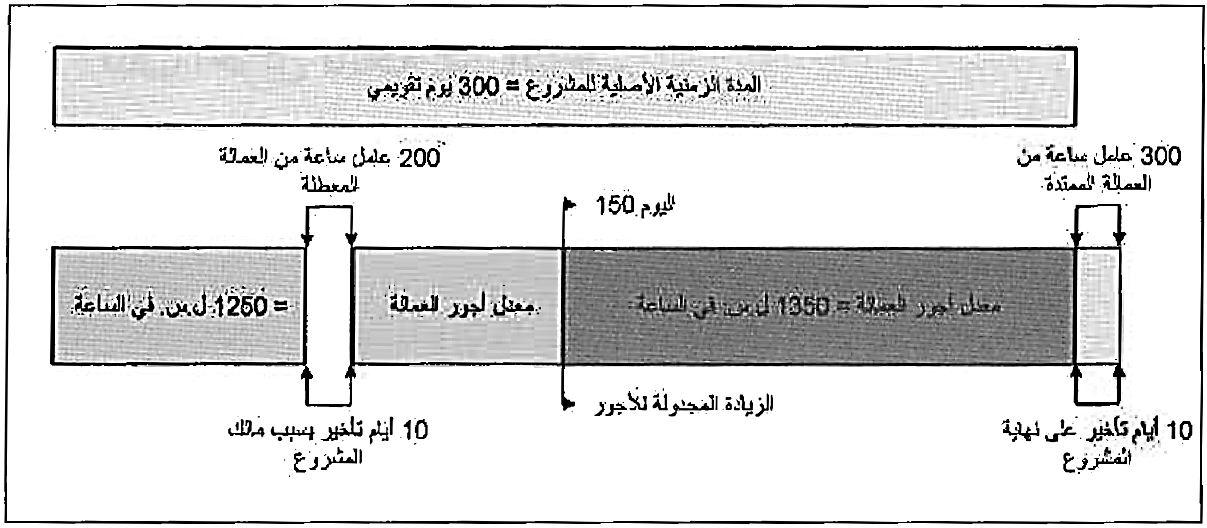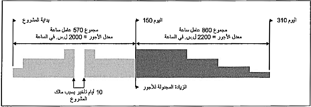 خطط مقاول ليبدأ مشروعاً في تاريخ محدد وينتهي بعد 300 يوم تقويمي. يستخدم المقاول عمالة موحدة من خلال اتفاقية تحدد تزايد الأجور عند فترات معينة، في هذا المثال ، يتزايد أجر العمالة في اليوم 150، معدل أجور العمالة قبل ازدياد الأجر هي 1250 ل.س في الساعة وتتصاعد حتى 1350 ل.س في الساعة بعد الزيادة. في الشهر الثالث من المشروع ، تسبب المالك بتأخير 10 أيام. تحمل مالك المشروع المسؤولية عن هذا التأخير. وامتد زمن المشروع بإصدار أمر تغيير بإضافة 10 أيام على نهاية المشروع الأصلية، يجب على المقاول أن يقدم كلفة العمالة المتعلقة بالتأخير، كما في الشكل (1).