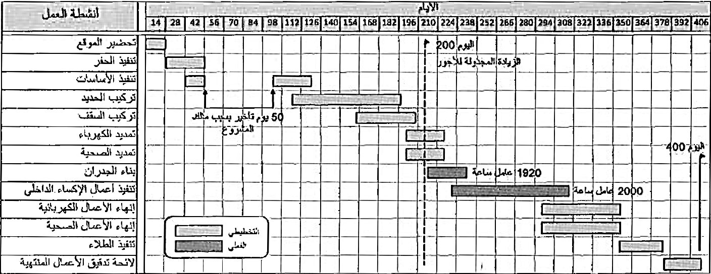 يظهر الشكل (4) المخطط الشريطي للعمل التخطيطي الأصلي. بينما يظهـر الشكل (5) المخطط الشريطي الفعلي للمشروع، والذي يظهر التأخيرات التي طرأت على المشروع. كما يظهـر أيضاً ساعات العمل الفعلية للنجارين لكل نشاط. (ساعات العمل هذه مأخوذة من التقارير اليومية للمشروع المسجلة بشكل معاصر).