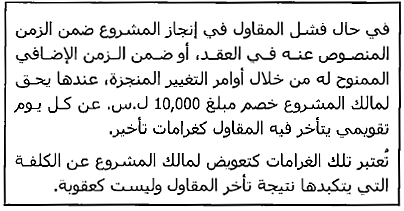 إذا أثبت المقاول أن مالك المشروع كان غير معقول في تقدير غرامات التأخير المحددة ، عندها لن يكـون البنـد ملزماً. فمثلاً، إذا أظهـر تقـدير مالك المشروع أن قيمة الخسائر المحتملة تبلغ 4,500 ل.س. في اليوم، لكن قيمة غرامات التأخير المحددة في العقـد كانت 10,000 ل.س. في اليـوم ، عندها ، تُفسر هذه القيمة على أنها عقوبة ولذلك لن تكون ملزمة.