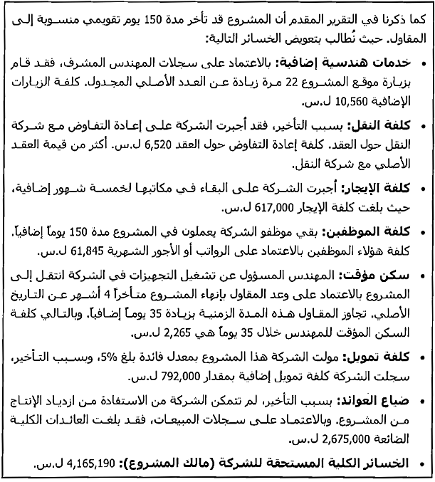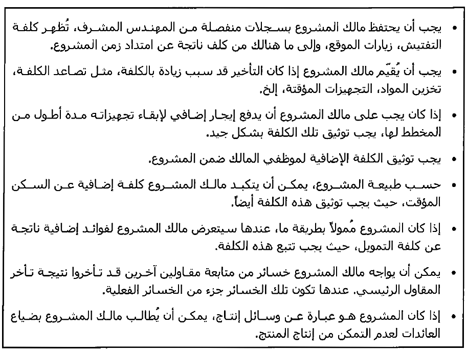 يمكن أن يتضمن تقدير غرامات التأخير كلف أخرى، إلا أن هذه اللائحة تُعطي فكرة عامة عـن أنـواع الكلف التي يجب أخذها بالاعتبار.