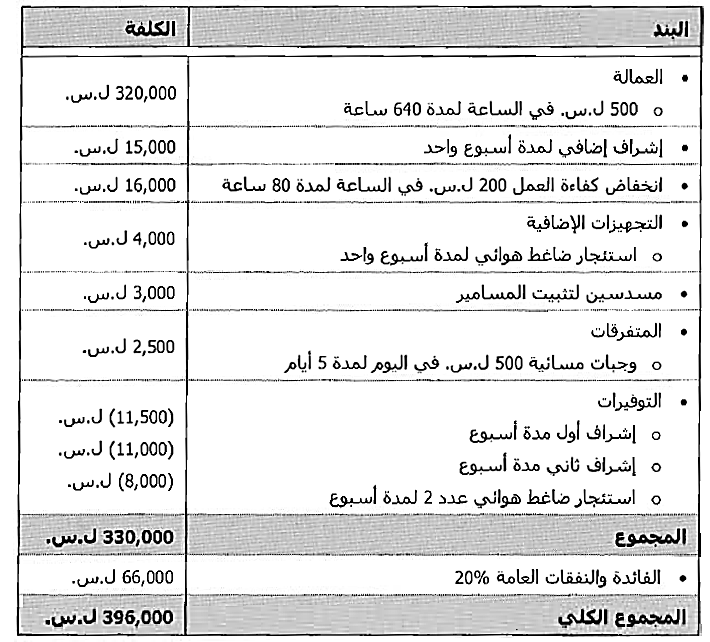 خطط مقاول ثانوي متخصص بنجارة البيتون لتركيب قالب الطابق الثاني باستخدام طاقمي عمل مؤلفين من 4 عمال لكل منهما يعملون 8 ساعات في اليوم لمدة 10 أيام عمل. بدلا من ذلك ، سيزيد المقاول القوى العاملة لتصبح 3 أطقم عمل يتألف كل منها من 4 عمال يعملون 12 ساعة في اليوم لينجزوا العمل خلال 5 أيام عمل. قبل تسريع العمل، كان متوسط معدل العمالة المثقل 1,500 ل.س. في الساعة ، أما بعد تسريع العمل، يتوقع متوسط معدل العمالة المثقـل أن يبلغ 2,000 ل.س. في الساعة. بالإضافة لذلك، لزم وجود طرف ثالث للإشراف. وبالتالي، توقع زيادة كلفة كل ساعة من العمل بمقدار 500 ل.س. في الساعة بسبب تسريع العمل، ولزوم وجود طرف ثالث للإشراف لمدة أسبوع.