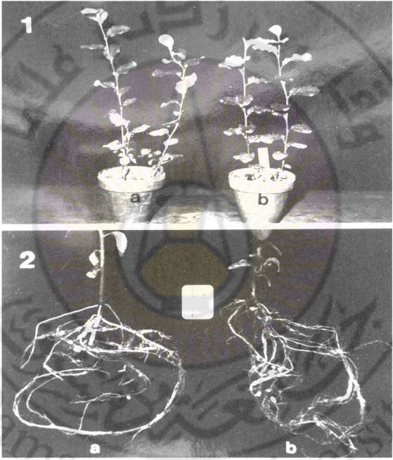 الشكل يبين مقارنة بين تجذير النباتات في البيت الزجاجي (a2) والتجذير بزراعة النسج (b2) في السفرجل.