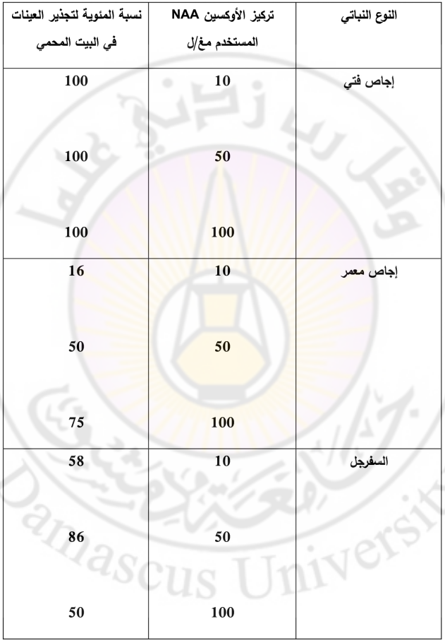 جدول يبين تجذير النموات الخضرية مباشرة في البيت المحمي