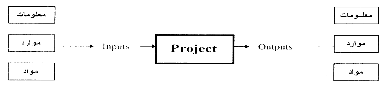 تسمى المعلومات والمواد والموارد التي تدخل في تنفيذ المشروع بالمدخلات (Inputs)، أما المعلومات والمواد والموارد التي تنتج من المشروع فتسمى بالمخرجات (Outputs)، شکل (1)