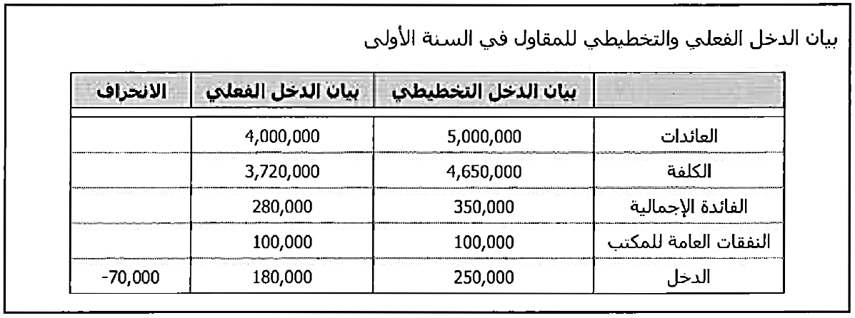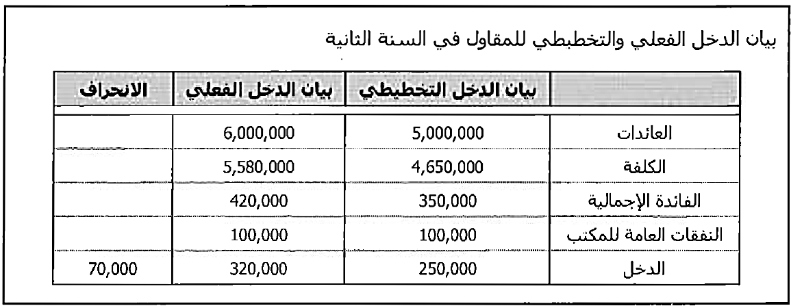 كما يظهر، فقد نتج عن تأخير المشروع C انحراف سلبي في الدخل قيمته 70,000 ل.س. خلال العام الأول. في العـام التـالي ، ربـح المقـاول خمسة عقـود أخـرى مـن F إلى 3، تبلغ قيمـة كـل منهـا 1,000,000 ل.س. بقيت بيانات الكلفة والنفقات العامة نفسها كما في السنة الأولى. تابع المقاول تنفيذ المشروع C ، وقد أنجزه خلال السنة الثانية ، مع العقـود مـن F إلى 3. بيـان الـدخل التخطيطي والفعلي للسنة الثانية يظهر في المثال (2).