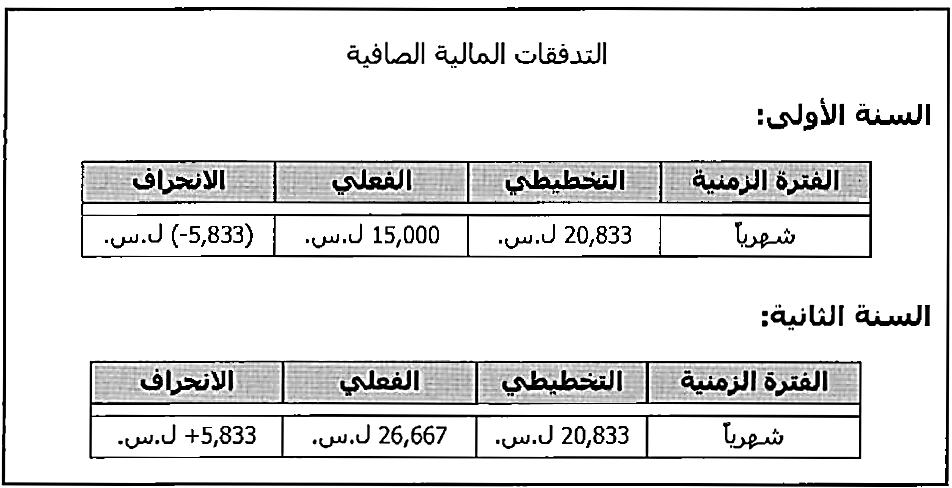 على خلاف السنة الأولى، التي أظهر فيها المقاول انحراف سلبي بمقدار 70,000 ل.س. بسبب توقف المشروع C، فإن إسهام تنفيذ المشروع C في السنة الثانية ، قد أوجـد تـوازنـاً إيجابياً بسبب متابعة تنفيذ المشروع C في ذلك العام. وكنتيجة لذلك، فإن التدفق المالي للمقاول في السنة الأولى قـد أثر سلباً في التأخير. حيث تمت معالجة كلفة هذا التأثير في العام التالي.