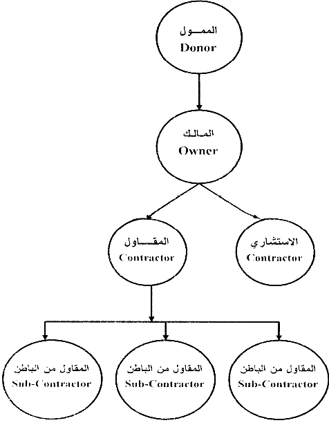 المالك أو صاحب العمل، والمهندس الذي يقوم نيابة عن صاحب العمل وبتكليف منه بتوفير الخدمات التقنية والمهنية اللازمة في تخطيط وتصميم وتنفيذ المشروع، والمقاول وهو الذي يقوم بالتنفيذ العملي للمشروع بما في ذلك توفير المواد والعمالة والآليات اللازمة لبناء المشروع. شكل (1) يوضح العلاقات التعاقدية في أي مشروع.