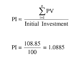 • أن تكون قيمة مؤشر الربحية (PI) أقل من 1 صحيح (1 > PI)، وهذا يعني أن المشروع خاسر لأن المبلغ العائد أقل من مبلغ الاستثمار الأساسي.