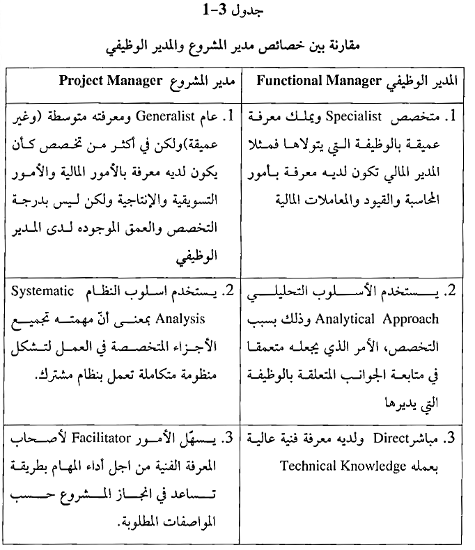 ورغم وجود تشابه في بعض الوظائف التي يمارسها كل من مدير المشروع والمدير الوظيفي الذي هو مدير أحد الوظائف في الشركة مثل مدير الإنتاج، المدير المالي، مدير التسويق...الخ، إلا إن هناك أنشطة مطلوب من مدير المشروع أداؤها تجعل هناك فروقاً في المواصفات والخصائص بين كل من مدير المشروع والمدير الوظيفي كما تظهر في جدول 3-1