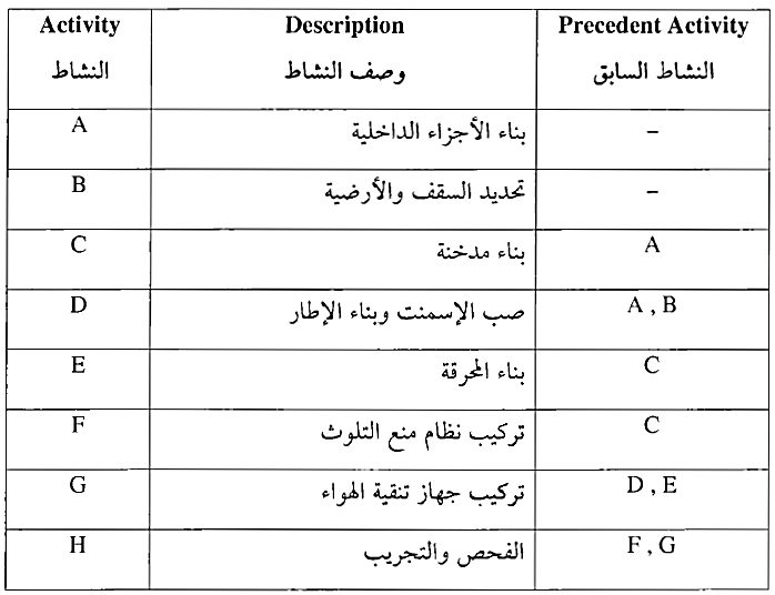 طلب من أحد المطابع القيام بتركيب محرقة ،ورق لتلبية شروط وزارة البيئة، وقد تم إعداد دراسة حول الأنشطة المطلوبة ومدى تتابعها كما يظهر في جدول 6-2