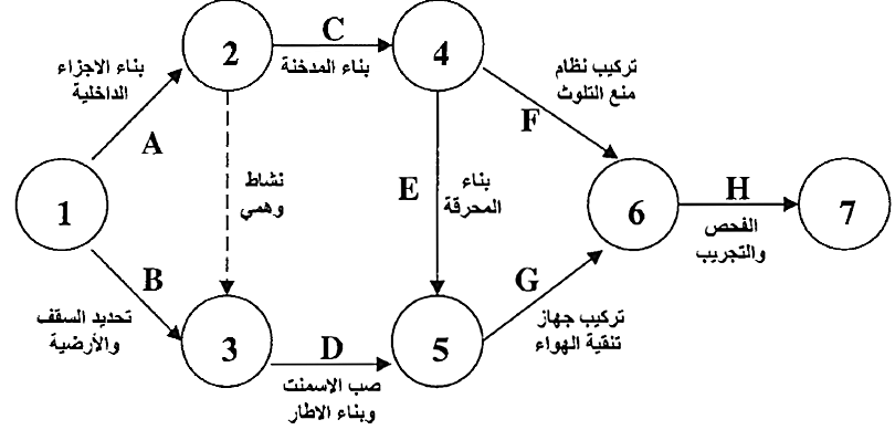 6. النشاط الوهمي Dummy Activity : وهو نشاط ليس له وجود، ويستخدم فقط لتسهيل رسم الشبكة وبيان العلاقة بين الأحداث فهو لا يحتاج إلى وقت ولا إلى موارد، ويرسم على الشبكة على شكل سهم منقط.