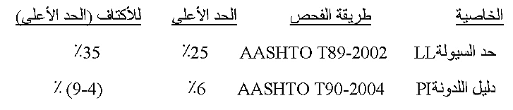 ب - يجب أن تحقق المواد العابرة من منخل رقم 40 (0.425 مم) عند تهيئتها بموجب AASHTO T146-2004 المتطلبات الاتية :