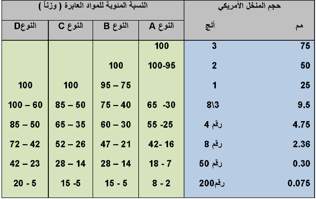 تكون المواد من مزيج الرمل والحصى المتدرج والمطابق لما يأتي: