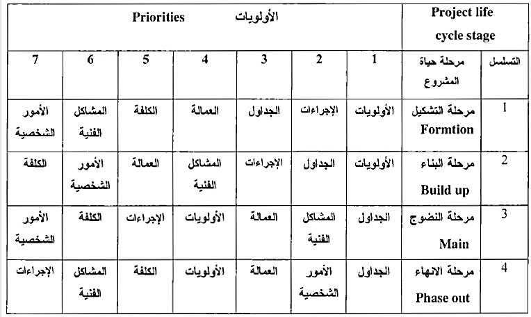 7- الأمور الشخصية Personality : وهذا العنصر يهتم بطبيعة الأفراد ومواصفاتهم الشخصية ويحدد طبيعة العلاقة بين الأفراد ومدى التقارب والتباعد بينهم وطريقة تعاملهم، وهذه تعتبر أحد مصادر الصراع في المشاريع. ويوضح الجدول 8-1 ترتيب مصادر الصراع عبر مراحل حياة المشروع المختلفة.
