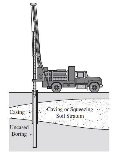 Exploratory borings are a series of vertical holes drilled into the ground. Typical depth of these holes ranges from 3 to 30 m with an inside diameter varies from 75 to 600 mm. Exploratory borings are typically drilled using two drilling equipment: flight auger and bucket auger, as illustrated in Figure 1. A wide variety of drilling techniques are used to deal with caving or squeezing soils including: