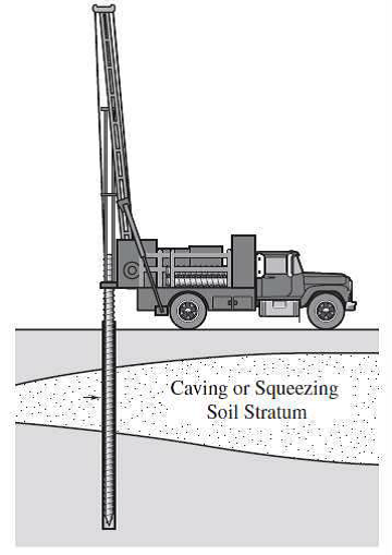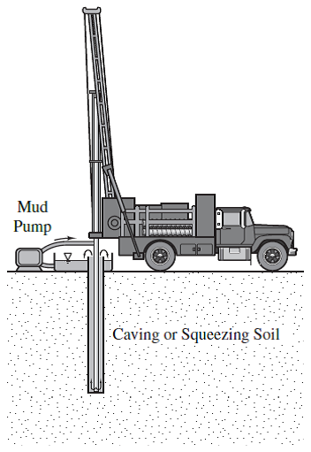 2) Rotary Wash Boring: this method involves filling the boring with a bentonite slurry to provide a sufficient lateral pressure on the sides of the boring, as shown in Figure 2b.