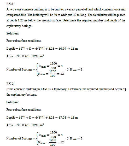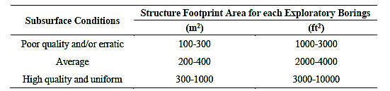 There are no specific rules that define depth, number and spacing of the exploratory borings in the field. However, Sowers (1979) provided general guidelines for approximately determining depth, spacing, and a number of exploratory borings at a proposed project. Table 1 and Table 2 present these guidelines .